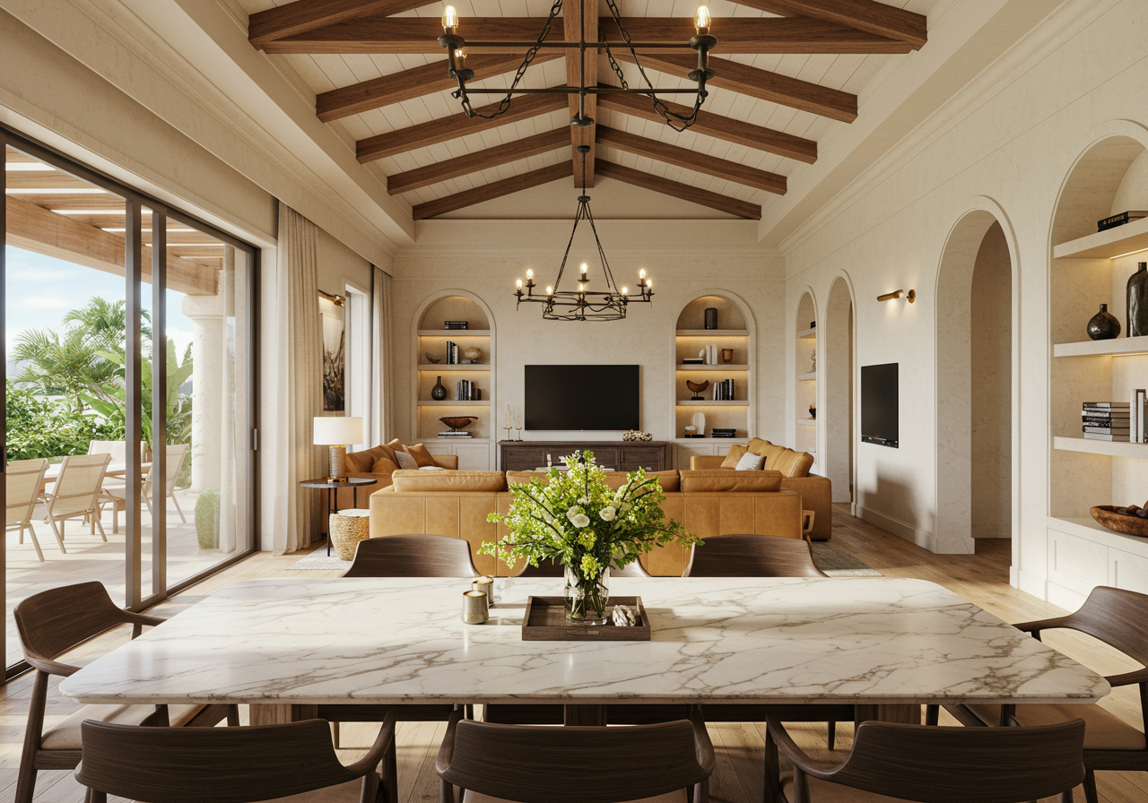 Furnishings, light fixtures, and décor all come together to subtly hint at the theme without becoming gaudy.